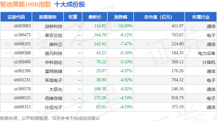 证券之星消息,1月19日,智选策略100R(489015)指数报收于5616.6点,涨0.27%,成交2653.66亿元,换手率3.89%。当日该指数成份股中,上涨的有42家,麦格米特以8.5%的涨幅领涨,下跌的有55家,剑桥科技以10.0%的跌幅领跌。