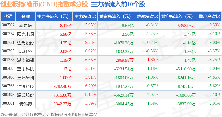 资金流向方面,创业板指(港币)(CNH)(970006)指数成份股当日主力资金净流出合计113.9亿元,游资资金净流入合计41.91亿元,散户资金净流入合计71.99亿元。成份股资金流向详情见下表: