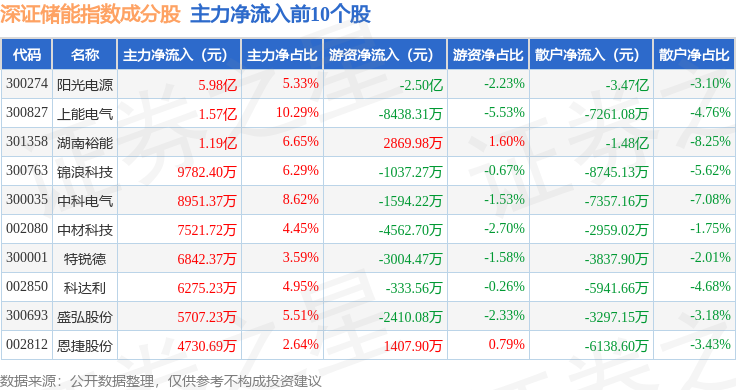 资金流向方面,深证储能(970036)指数成份股当日主力资金净流出合计31.08亿元,游资资金净流入合计5.45亿元,散户资金净流入合计25.64亿元。成份股资金流向详情见下表:
