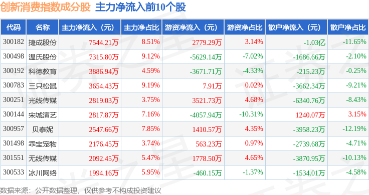 资金流向方面,创新消费(970041)指数成份股当日主力资金净流出合计17.73亿元,游资资金净流入合计6.7亿元,散户资金净流入合计11.03亿元。成份股资金流向详情见下表:
