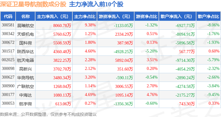 资金流向方面,深证卫星导航(970050)指数成份股当日主力资金净流出合计42.5亿元,游资资金净流入合计11.81亿元,散户资金净流入合计30.69亿元。成份股资金流向详情见下表: