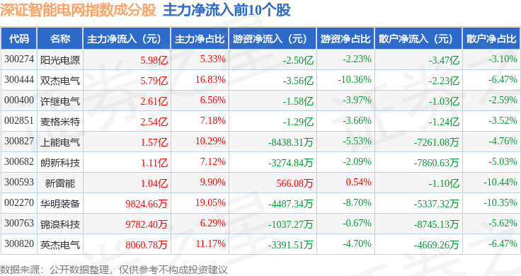 资金流向方面,深证智能电网(970054)指数成份股当日主力资金净流入合计20.38亿元,游资资金净流出合计12.64亿元,散户资金净流出合计7.74亿元。成份股资金流向详情见下表: