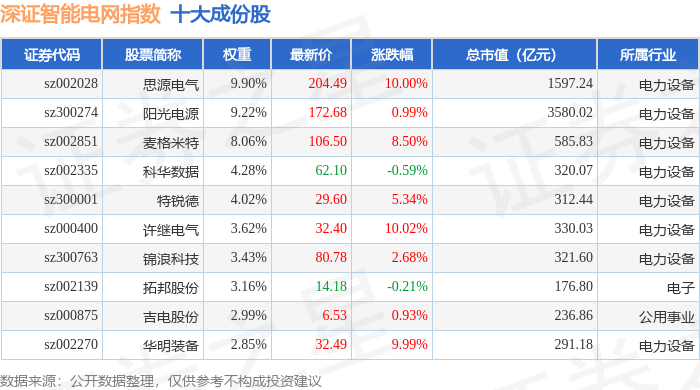 证券之星消息,1月19日,深证智能电网(970054)指数报收于4591.39点,涨4.98%,成交592.56亿元,换手率7.03%。当日该指数成份股中,上涨的有42家,双杰电气以20.0%的涨幅领涨,下跌的有8家,科远智慧以1.62%的跌幅领跌。