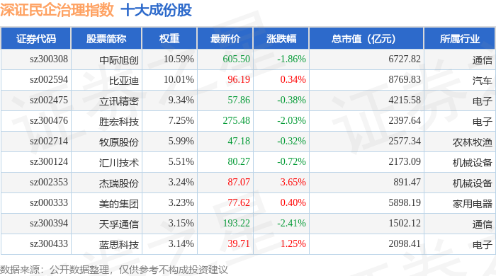 深证民企治理(970058)指数十大成份股详情如下: