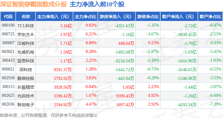 资金流向方面,深证智能穿戴(970074)指数成份股当日主力资金净流出合计33.72亿元,游资资金净流入合计6.04亿元,散户资金净流入合计27.68亿元。成份股资金流向详情见下表: