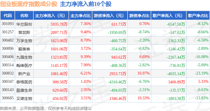 资金流向方面,创业板医疗(970082)指数成份股当日主力资金净流出合计6.68亿元,游资资金净流入合计2.34亿元,散户资金净流入合计4.34亿元。成份股资金流向详情见下表:
