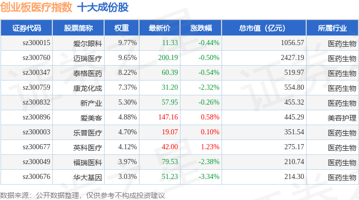 创业板医疗(970082)指数十大成份股详情如下: