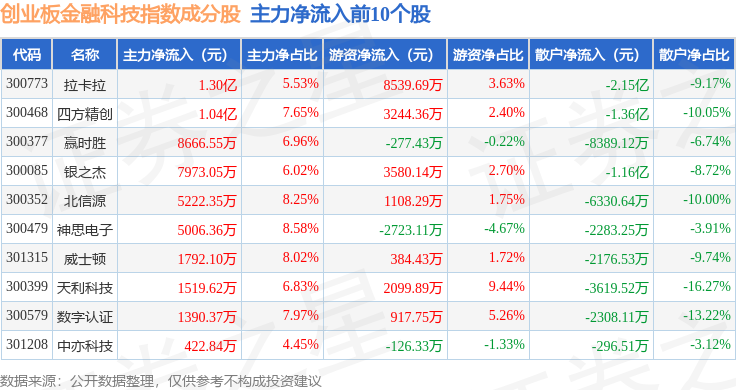 资金流向方面,创业板金融科技(970085)指数成份股当日主力资金净流出合计20.86亿元,游资资金净流入合计12.55亿元,散户资金净流入合计8.31亿元。成份股资金流向详情见下表: