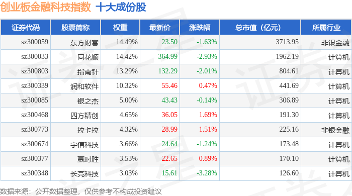证券之星消息,1月19日,创业板金融科技(970085)指数报收于3149.27点,跌1.06%,成交360.43亿元,换手率3.96%。当日该指数成份股中,上涨的有13家,北信源以3.26%的涨幅领涨,下跌的有31家,长亮科技以3.28%的跌幅领跌。