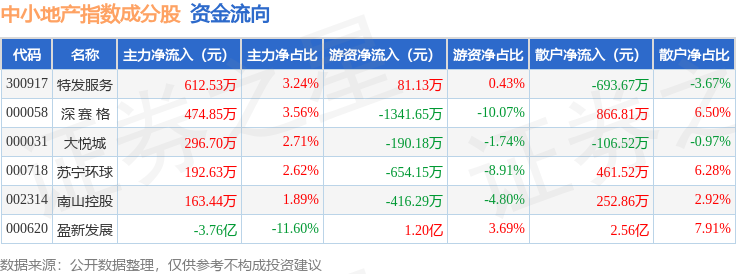 资金流向方面,中小地产(971002)指数成份股当日主力资金净流出合计3.58亿元,游资资金净流入合计9433.38万元,散户资金净流入合计2.64亿元。成份股资金流向详情见下表: