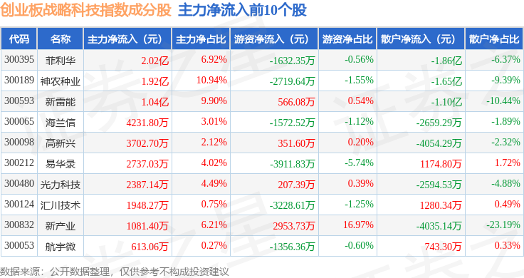 资金流向方面,创业板战略科技(971004)指数成份股当日主力资金净流出合计13.0亿元,游资资金净流入合计8.35亿元,散户资金净流入合计4.66亿元。成份股资金流向详情见下表: