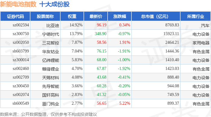 资金流向方面,新能电池(980032)指数成份股当日主力资金净流出合计33.32亿元,游资资金净流入合计6.43亿元,散户资金净流入合计26.44亿元。成份股资金流向详情见下表: