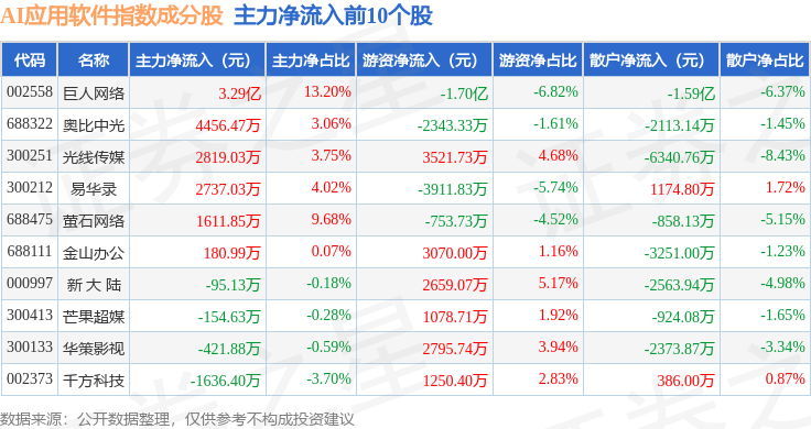 资金流向方面,AI应用软件(980107)指数成份股当日主力资金净流出合计69.19亿元,游资资金净流入合计19.62亿元,散户资金净流入合计49.57亿元。成份股资金流向详情见下表: