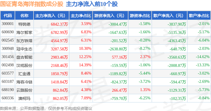 资金流向方面,国证青岛海洋(980532)指数成份股当日主力资金净流入合计2.61亿元,游资资金净流出合计4929.08万元,散户资金净流出合计2.39亿元。成份股资金流向详情见下表: