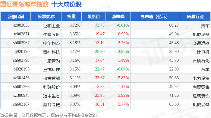 国证青岛海洋(980532)指数十大成份股详情如下: