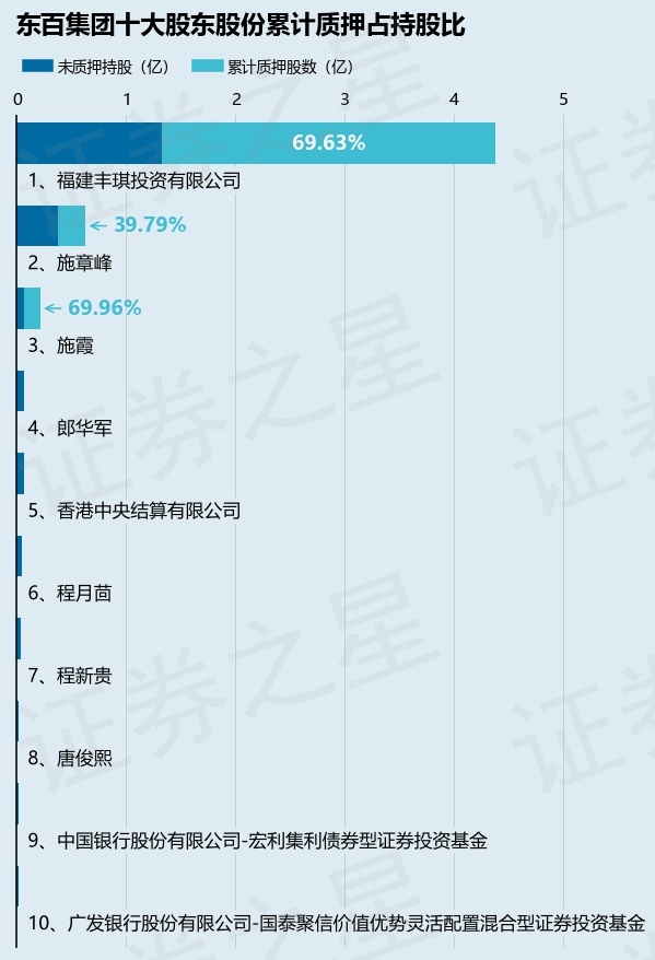 截止本公告日,股东福建丰琪投资有限公司已累计质押股份3.05亿股,占其持股总数的69.63%,股东施章峰已累计质押股份2500.0万股,占其持股总数的39.79%,股东施霞已累计质押股份1498.0万股,占其持股总数的69.96%。本次质押后东百集团十大股东的累计质押股份占持股比例(占持股比例的计算以公司最新一期财务报表公布的十大股东的持股总数为基准)见下图: