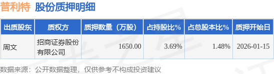 证券之星消息,普利特(002324)1月19日公开信息显示,股东周文向招商证券股份有限公司合计质押1650.0万股,占总股本1.48%。质押详情见下表: