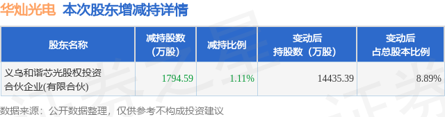 证券之星消息,1月19日华灿光电发布公告《华灿光电:关于持股5%以上股东减持股份触及1%整数倍的公告》,其股东义乌和谐芯光股权投资合伙企业(有限合伙)于2025年9月24日至2026年1月16日间合计减持1794.59万股,占公司目前总股本的1.1057%,变动期间该股股价下跌1.37%,截止1月16日收盘报8.64元。