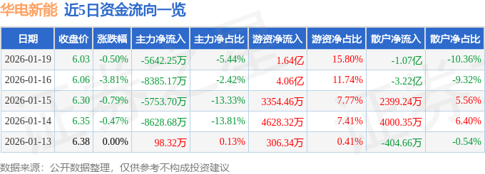 证券之星消息,截至2026年1月19日收盘,华电新能(600930)报收于6.03元,下跌0.5%,换手率5.33%,成交量172.12万手,成交额10.37亿元。