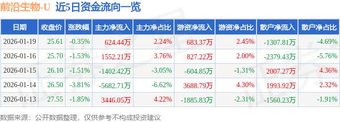 证券之星消息,截至2026年1月19日收盘,前沿生物(688221)报收于25.61元,下跌0.35%,换手率2.9%,成交量10.86万手,成交额2.79亿元。