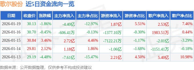 证券之星消息,截至2026年1月19日收盘,歌尔股份(002241)报收于30.13元,下跌1.86%,换手率3.57%,成交量112.19万手,成交额33.96亿元。