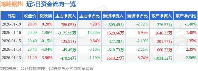 证券之星消息,截至2026年1月19日收盘,鸿路钢构(002541)报收于20.04元,上涨0.2%,换手率1.9%,成交量9.41万手,成交额1.87亿元。