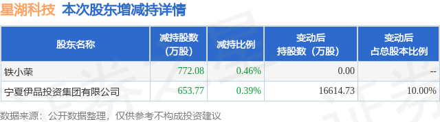 证券之星消息,1月19日星湖科技发布公告《星湖科技:关于持股5%以上股东权益变动触及5%刻度的提示性公告》,其股东铁小荣、宁夏伊品投资集团有限公司于2025年11月19日至2026年1月16日间合计减持1425.85万股,占公司目前总股本的0.8582%,变动期间该股股价上涨1.13%,截止1月16日收盘报7.17元。