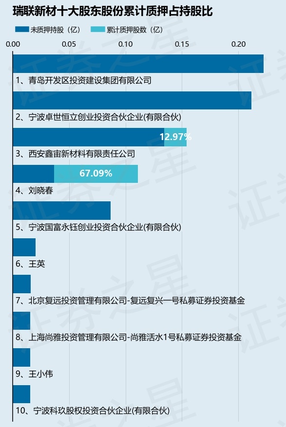 截止本公告日,股东西安鑫宙新材料有限责任公司已累计质押股份200.0万股,占其持股总数的12.97%,股东刘晓春已累计质押股份743.0万股,占其持股总数的67.09%。本次质押后瑞联新材十大股东的累计质押股份占持股比例(占持股比例的计算以公司最新一期财务报表公布的十大股东的持股总数为基准)见下图: