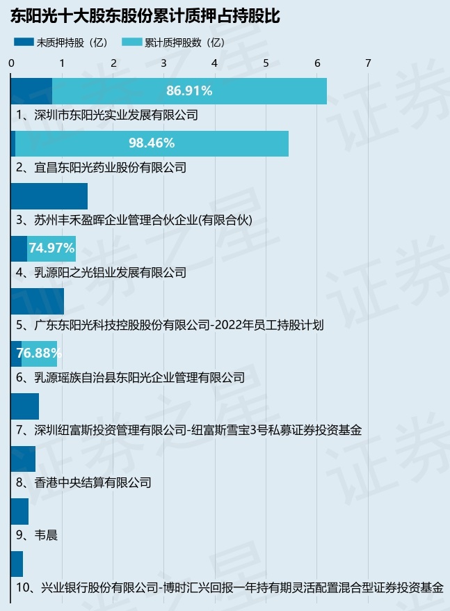 截止本公告日,股东深圳市东阳光实业发展有限公司已累计质押股份5.39亿股,占其持股总数的86.91%,股东宜昌东阳光药业股份有限公司已累计质押股份5.37亿股,占其持股总数的98.46%,股东乳源阳之光铝业发展有限公司已累计质押股份9600.0万股,占其持股总数的74.97%,股东乳源瑶族自治县东阳光企业管理有限公司已累计质押股份7000.0万股,占其持股总数的76.88%。本次质押后东阳光十大股东的累计质押股份占持股比例(占持股比例的计算以公司最新一期财务报表公布的十大股东的持股总数为基准)见下图: