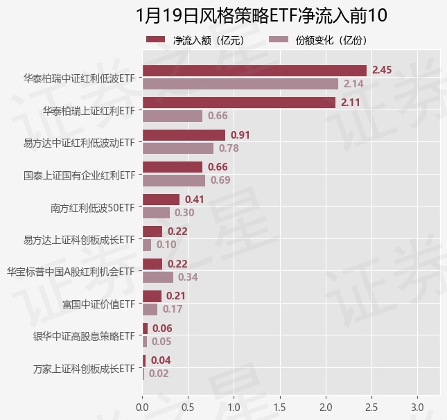 当日有16只风格策略ETF基金出现资金净流入,其中净流入排首位的是华泰柏瑞中证红利低波ETF(512890),份额增加了2.14亿份,净流入额为2.45亿元。