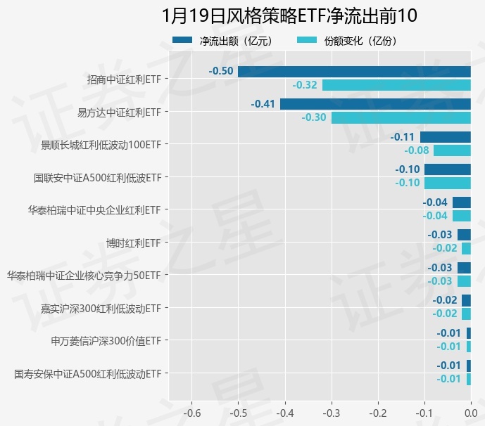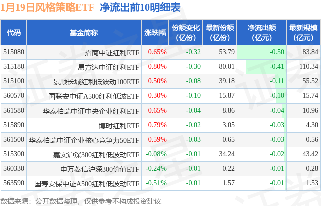 当日有10只风格策略ETF基金出现资金净流出,其中净流出排首位的是招商中证红利ETF(515080),份额减少了3200.0万份,净流出额为4966.64万元。