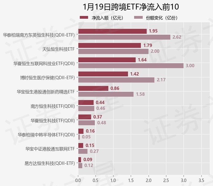 当日有26只跨境ETF基金出现资金净流入,其中净流入排首位的是华泰柏瑞南方东英恒生科技(QDII-ETF)(513130),份额增加了2.62亿份,净流入额为1.95亿元。