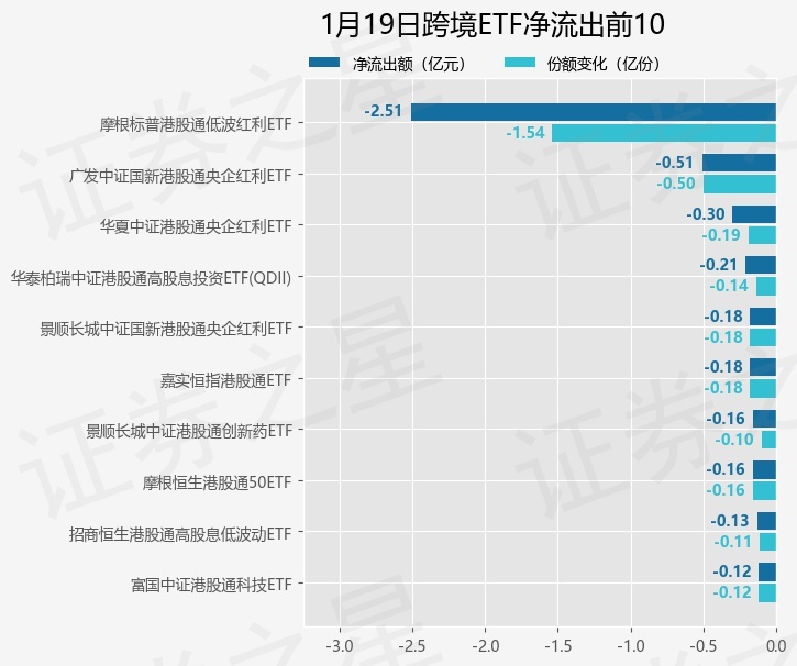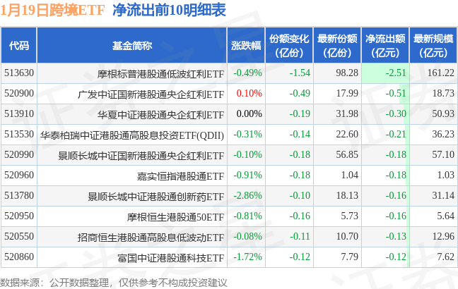 当日有33只跨境ETF基金出现资金净流出,其中净流出排首位的是摩根标普港股通低波红利ETF(513630),份额减少了1.54亿份,净流出额为2.51亿元。
