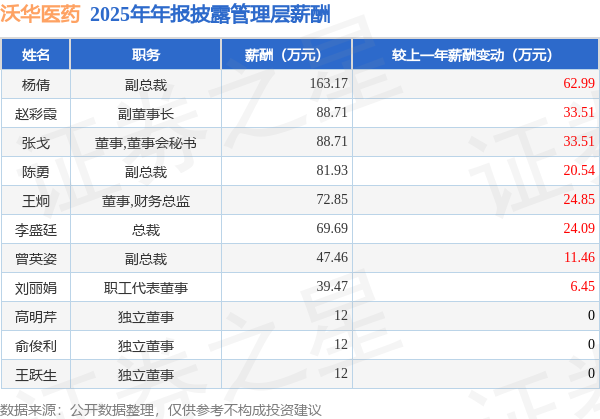 证券之星消息,沃华医药发布2025年年报,数据显示:公司主营收入8.17亿元,同比增6.96%。归母净利润为9571.53万元,同比增162.93%。扣非净利润为9210.67万元,同比增168.2%。当年公司员工总数1018人,同比减6.52%。人均薪酬16.1万元(注:"人均薪酬"根据定期报告中"应付职工薪酬"附注的本期增加值 / 员工总数计算而来),同比增2.05%。人均创收80.25万元,同比增14.42%。人均创利8.72万元,同比增181.36%。其中管理层薪酬总额为687.99万元,同比上一年增19.05%,薪酬最高的为副总裁杨倩,薪酬163.17万元。