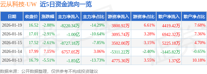 证券之星消息,截至2026年1月19日收盘,云从科技(688327)报收于16.52元,下跌2.88%,换手率4.14%,成交量34.54万手,成交额5.75亿元。