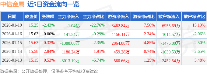 证券之星消息,截至2026年1月19日收盘,中信金属(601061)报收于15.25元,下跌2.43%,换手率5.96%,成交量29.88万手,成交额4.58亿元。