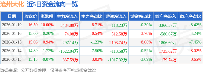 1月19日的资金流向数据方面,主力资金净流入3484.8万元,占总成交额8.71%,游资资金净流出118.23万元,占总成交额0.3%,散户资金净流出3366.57万元,占总成交额8.42%。