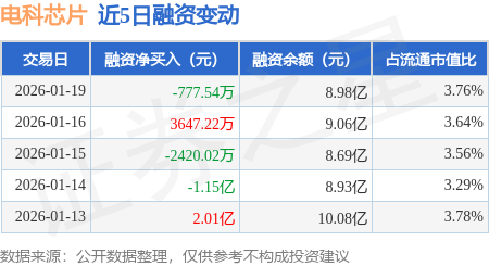 证券之星消息,1月19日,电科芯片(600877)融资买入1.17亿元,融资偿还1.25亿元,融资净卖出777.54万元,融资余额8.98亿元,近20个交易日中有11个交易日出现融资净买入。