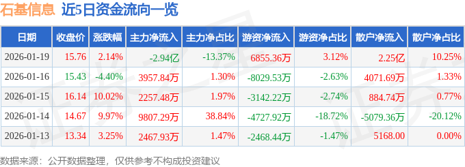 证券之星1月20日盘中消息,14点30分石基信息(002153)触及跌停板。其所属行业软件开发目前下跌。领涨股为*ST立方。该股为新零售,蚂蚁集团概念股,AI营销概念热股,当日新零售概念上涨0.11%。