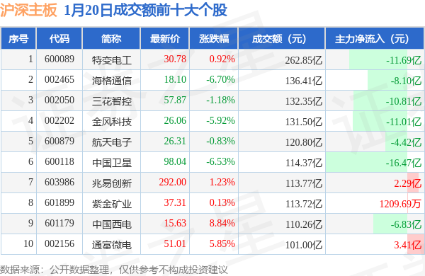 当日沪深主板成交额前10大个股中5只个股收涨,平均涨幅3.39%,其中特变电工(600089)以成交额262.85亿元排第一。从主力资金流入看,成交额前10大个股中有3只个股呈现主力资金净流入。