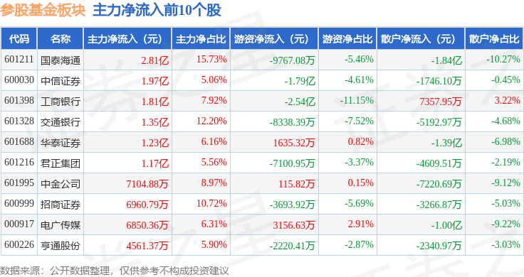 从资金流向上来看,当日参股基金板块主力资金净流出67.82万元,游资资金净流出4.22亿元,散户资金净流入4.22亿元。参股基金板块个股资金流向见下表: