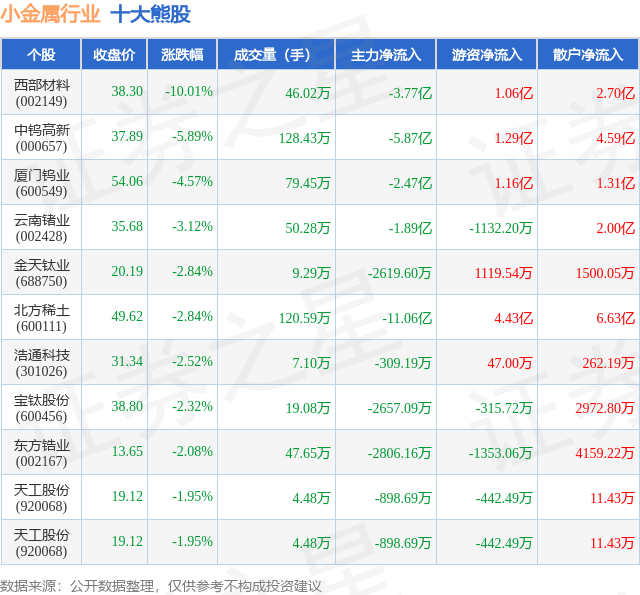 个股表现方面,小金属行业当日领跌股为西部材料(002149),该股当日报收38.3,下跌10.01%,成交量46.02万,主力资金净流出3.77亿元。中钨高新(000657)以下跌5.89%紧随其后,该股当日成交量128.43万,主力资金净流出5.87亿元。除此之外,厦门钨业(600549)、云南锗业(002428)、金天钛业(688750)均进入当日熊股之列。具体个股列表见下表:
