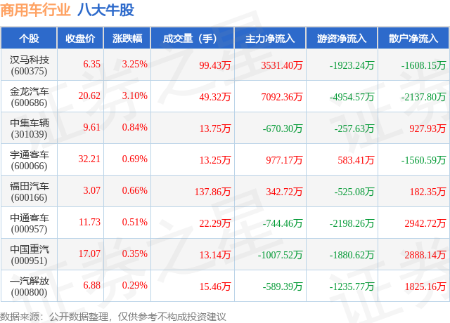 个股表现方面,商用车行业当日领涨股为汉马科技(600375),该股当日报收6.35,上涨3.25%,成交量99.43万,主力资金净流入3531.4万元。金龙汽车(600686)以上涨3.1%紧随其后,该股当日成交量49.32万,主力资金净流入7092.36万元。除此之外,中集车辆(301039)、宇通客车(600066)、福田汽车(600166)均进入当日牛股之列。具体个股列表见下表: