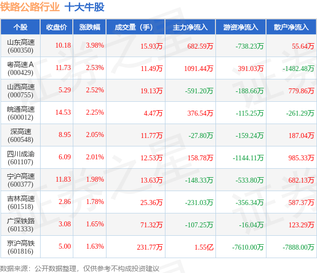 个股表现方面,铁路公路行业当日领涨股为山东高速(600350),该股当日报收10.18,上涨3.98%,成交量15.93万,主力资金净流入682.59万元。粤高速A(000429)以上涨2.53%紧随其后,该股当日成交量11.49万,主力资金净流入1091.44万元。除此之外,山西高速(000755)、皖通高速(600012)、深高速(600548)均进入当日牛股之列。具体个股列表见下表: