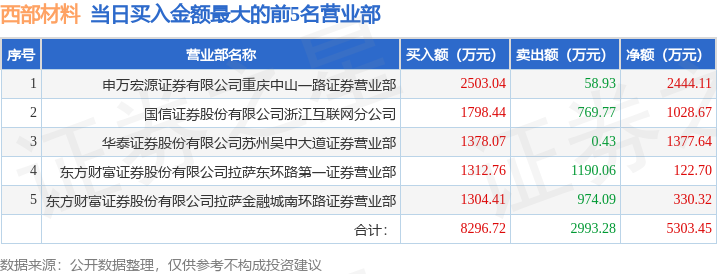 证券之星消息,沪深交易所2026年1月20日公布的交易公开信息显示,西部材料(002149)因日跌幅偏离值达到7%的前5只证券登上龙虎榜。此次是近5个交易日内第1次上榜。