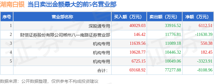 证券之星消息,沪深交易所2026年1月20日公布的交易公开信息显示,湖南白银(002716)因日涨幅偏离值达到7%的前5只证券登上龙虎榜。此次是近5个交易日内第2次上榜。