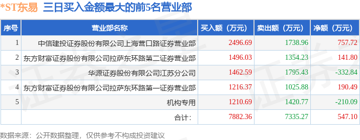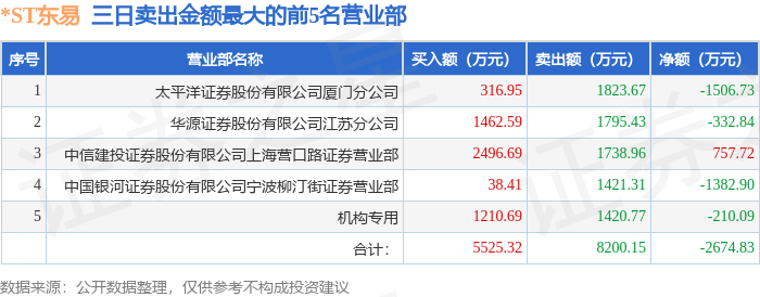 证券之星消息,沪深交易所2026年1月20日公布的交易公开信息显示,*ST东易(002713)因连续三个交易日内,跌幅偏离值累计达到12%的ST证券、*ST证券和未完成股改证券登上龙虎榜。此次是近5个交易日内第1次上榜。