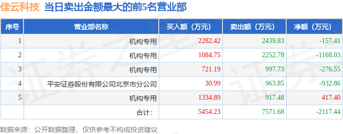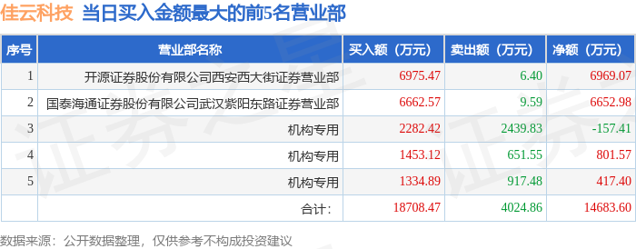 证券之星消息,沪深交易所2026年1月20日公布的交易公开信息显示,佳云科技(300242)因日涨幅达到15%的前5只证券登上龙虎榜。此次是近5个交易日内第1次上榜。