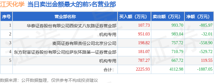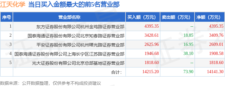 证券之星消息,沪深交易所2026年1月20日公布的交易公开信息显示,江天化学(300927)因日涨幅达到15%的前5只证券登上龙虎榜。此次是近5个交易日内第1次上榜。