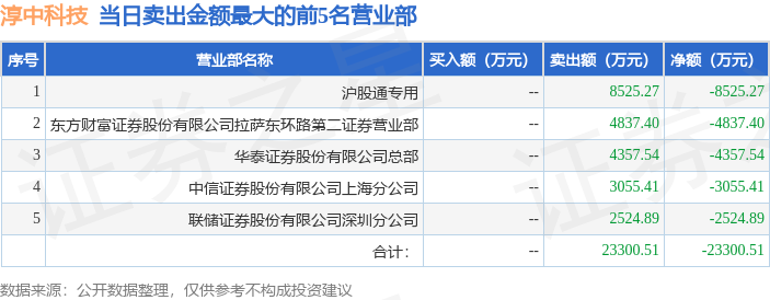 证券之星消息,沪深交易所2026年1月20日公布的交易公开信息显示,淳中科技(603516)因有价格涨跌幅限制的日收盘价格跌幅偏离值达到7%的前五只证券登上龙虎榜。此次是近5个交易日内第1次上榜。